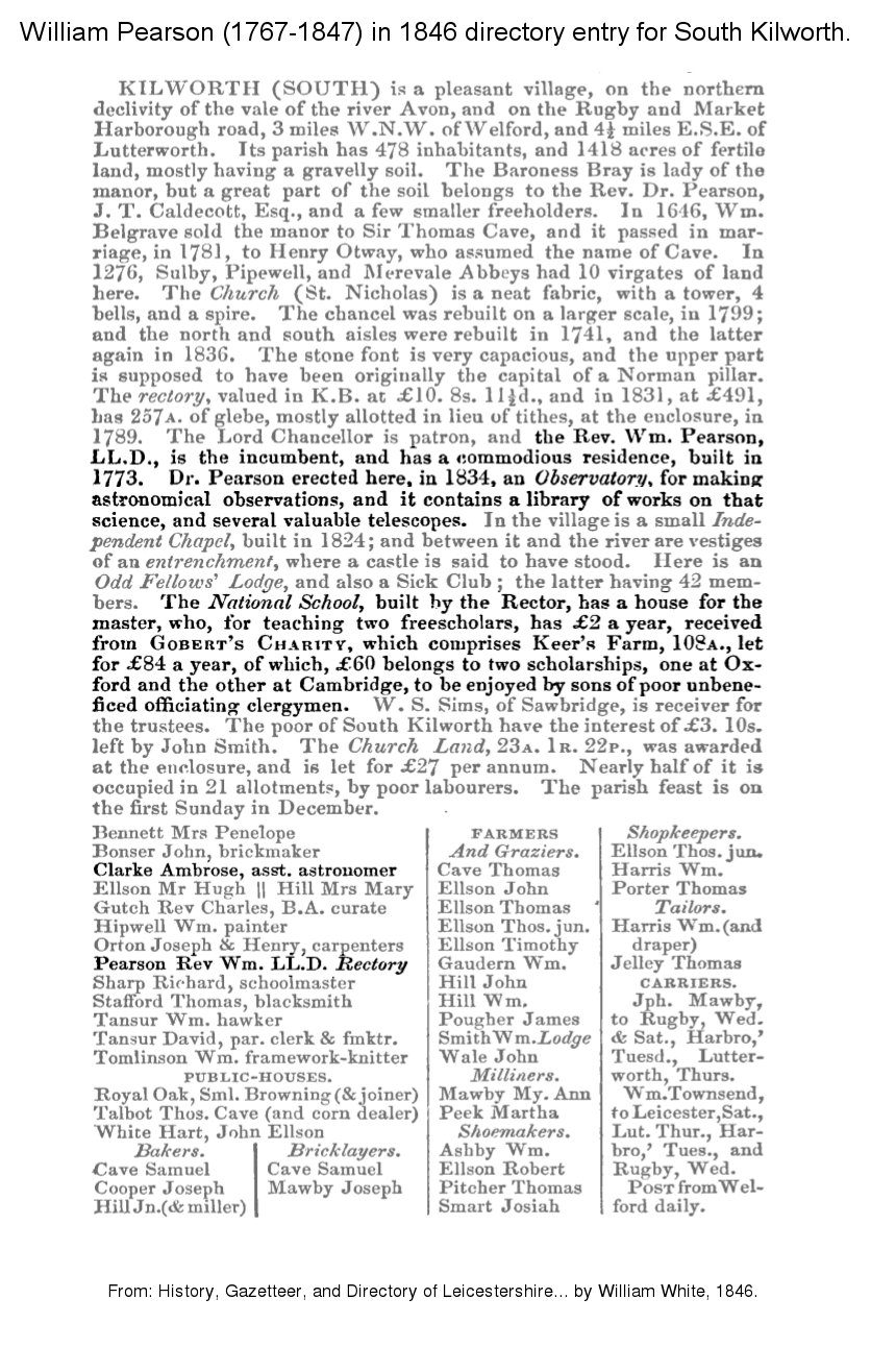 1846 directory entry for South Kilworth | It mentions Pearson's observatory, built in 1834. Click on image for larger version. |