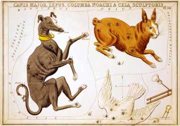 Canis Major, Lepus, Columba Noachi and Cela Sculptoris, plate 30 in Urania's Mirror (Wikipedia) |