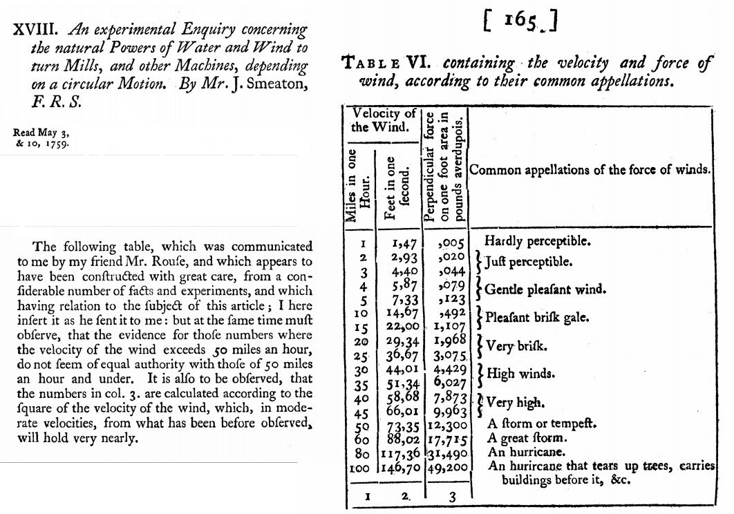 Rouse's table on the velocity and force of wind in Smeaton's 1759