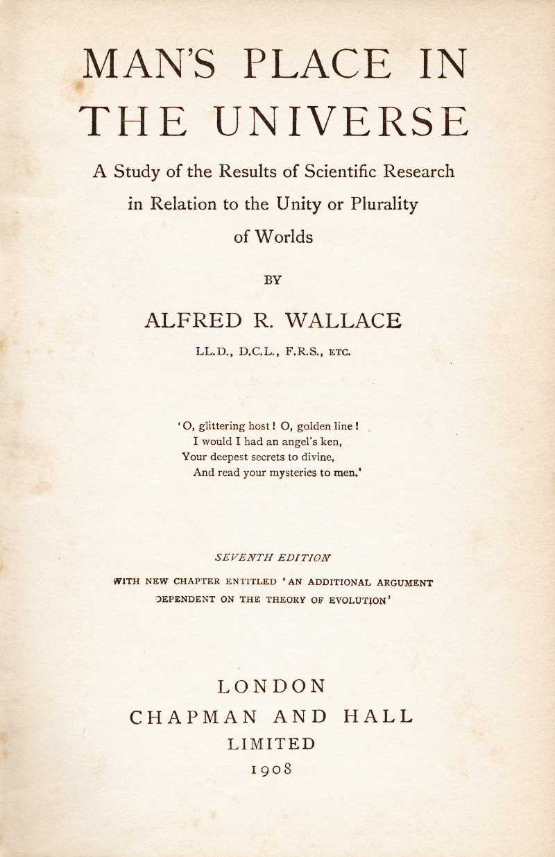 Alfred Russel Wallace is best known as a naturalist, and for his work on evolution by natural selection. Amongst the books he wrote is Man's Place In The Universe, 1903.