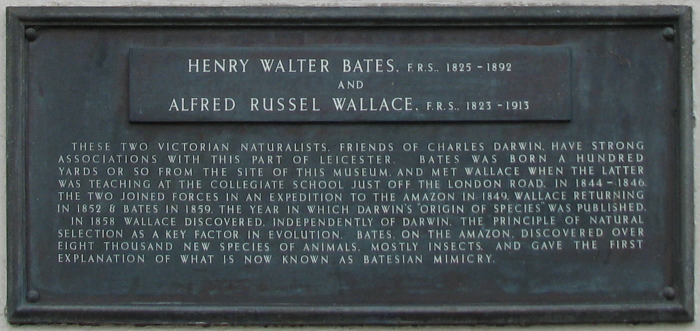 The plaque commemorates Wallace and Bates and mentions their expedition to the Amazon in 1849. Citing his meeting with Bates, and reading Malthus' Principles of Population at the library, Wallace wrote, "My year spent at Leicester must, therefore, be considered as perhaps the most important in my early life." (My Life, Vol I, p240) |