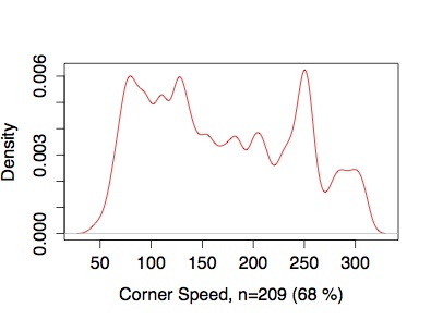Corner Speeds in Formula 1During a discussion on F1Fanatic of design philosophies of formula 1 cars I made a probability density function of F1 corner speeds. |