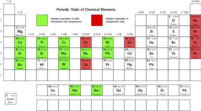 Periodic TableI have made a periodic table based on the excellent TikZ Latex code of Ivan Griffin. You can get the original table here. Using this code it is very easy to customise the table to show variations between elements, for example, which elements have isotope anomalies in meteorites.