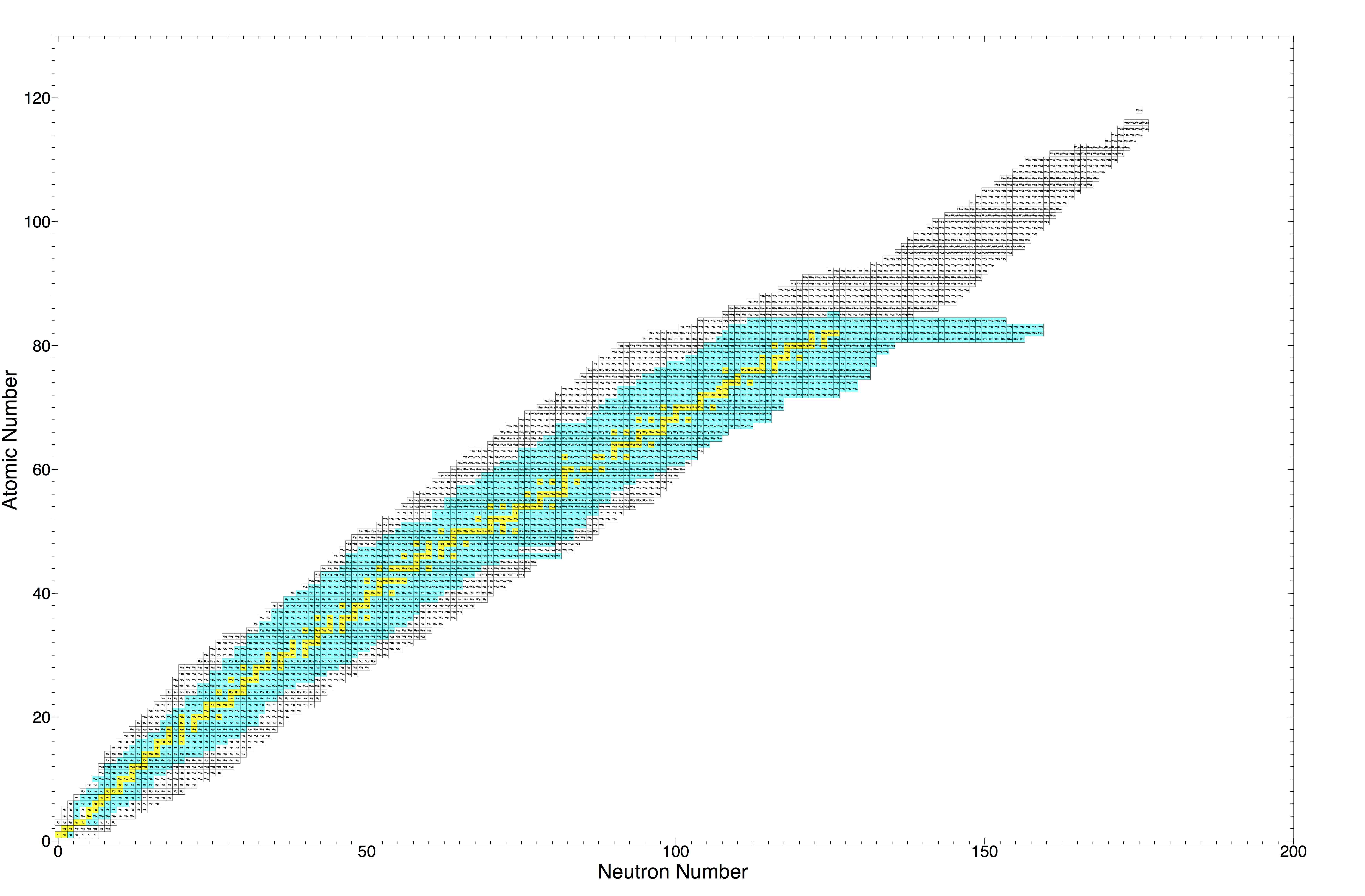 Table of nuclidesWhen working with nucleosynthetic models I find it useful to be able to plot the nuclides used in the reaction network. Below I have plotted stable nuclides in yellow, nuclides used by Woosley 2007 in blue and all others in white.